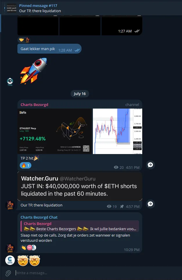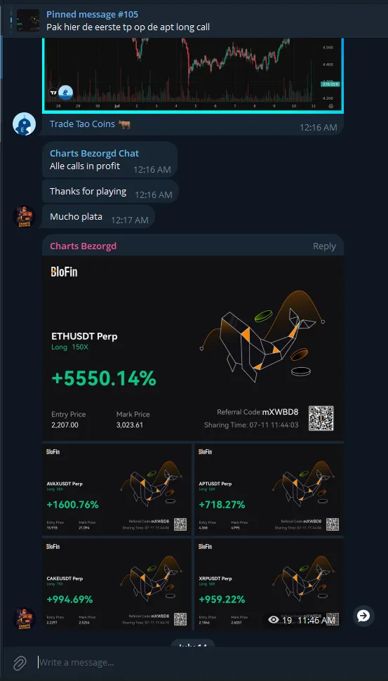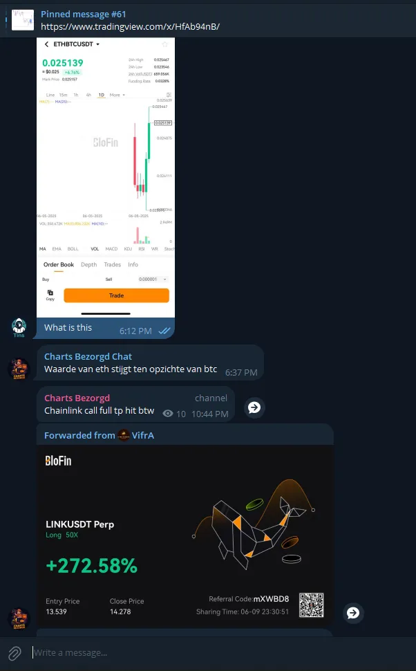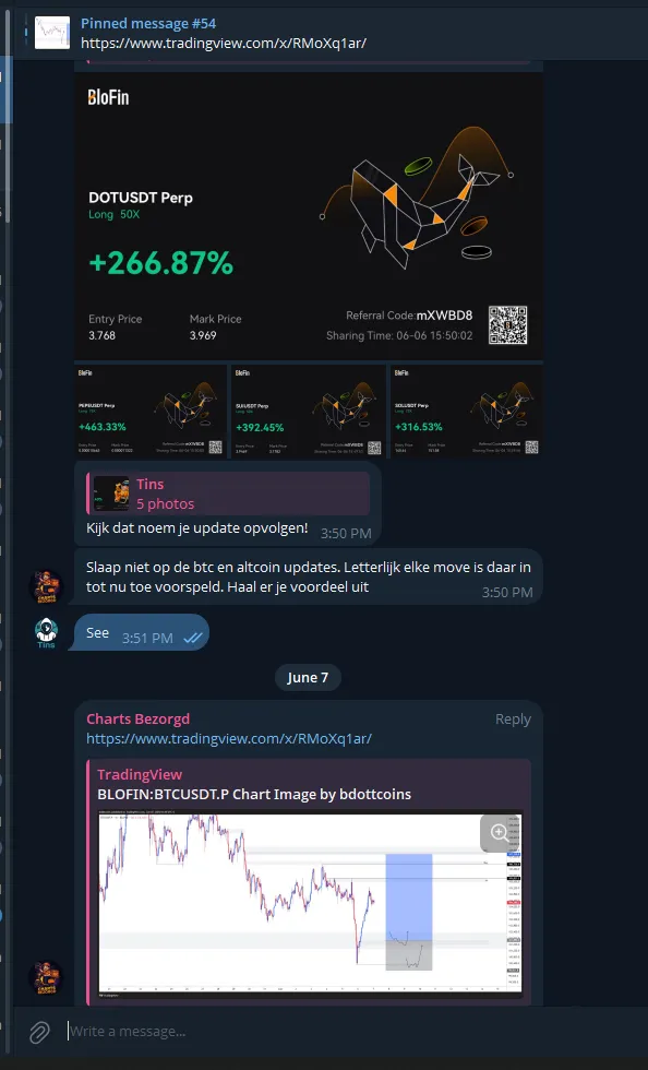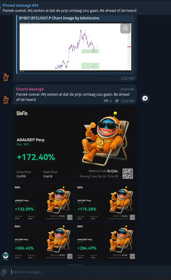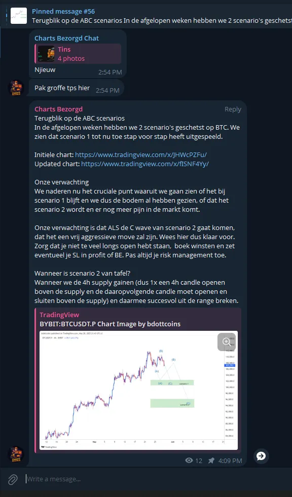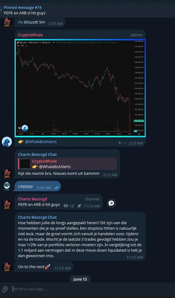 Bij Charts Bezorgd draait alles om transparante context, duidelijke niveaus en risk-management. Geen paywall, geen hype — wél dagelijks echte marktstructuur en setups die je iets leren. Hieronder zie je hoe we werken: eerst een visuele showcase, daarna een muur met live screenshots uit de groep.